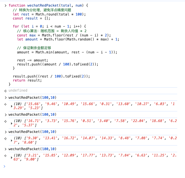 - 每次随机范围 = 剩余金额 / 剩余人数 × 2